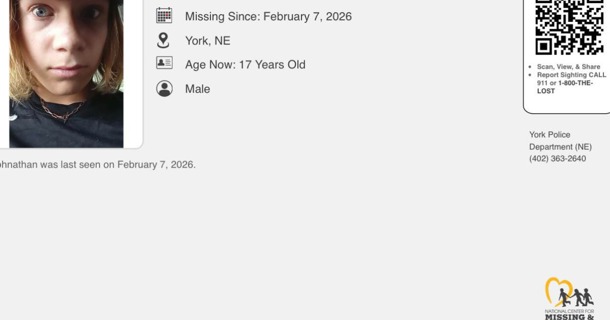 Johnathan Sipe was reported a missing/runaway juvenile on February 7th, 2026. This is an active investigation and officers are currently working to locate the juvenile and ensure his safe return. On February 10th, 2026, officers determined that Johnathan was in Grand Island. We are asking for the public’s assistance and anyone with information regarding the juvenile’s whereabouts is encouraged to contact the York Police Department. If you have an immediate sighting, please call 911. At this time, we are currently trying to locate Johnathan Sipe and want to encourage him to return home. There is no indication that he is in danger or his safety is at risk.