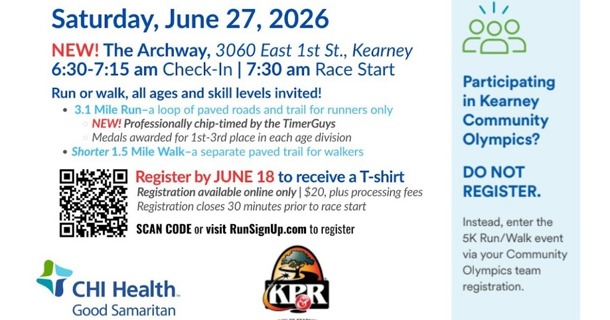 KEARNEY -CHI Health Good Samaritan, in collaboration with Kearney Park and Recreation, will host the annual Good Samaritan Olympiad 5K and 1.5 Mile Walk on Saturday, June 27. Welcoming runners and walkers of all ages and abilities, this widely attended event is a long-standing central Nebraska tradition.